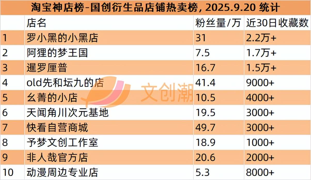 本周统计到的文创IP衍生店铺热卖榜,前五分别是: