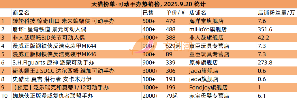 本周文创潮统计到的天猫可动手办热销榜,转轮科技 惊奇山口 未来蝙蝠侠 可动手办在榜首位置。