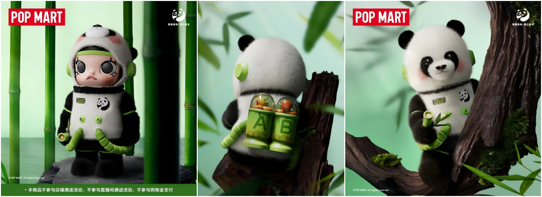 这是泡泡玛特Mega Collection系列与成都大熊猫繁育研究基地的合作款,采用贴毛工艺,并且将原系列中的太空摄影机替换为竹子配件。