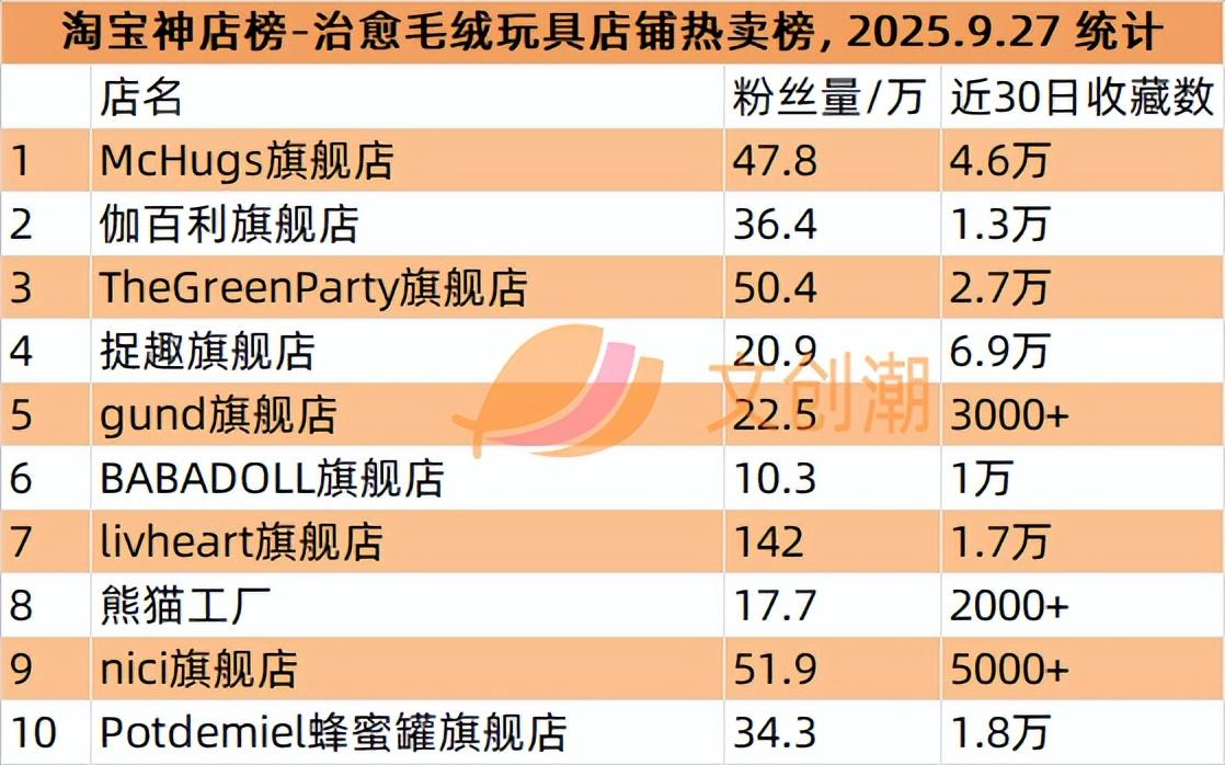 治愈毛绒玩具店铺热卖榜,前五名分别是: