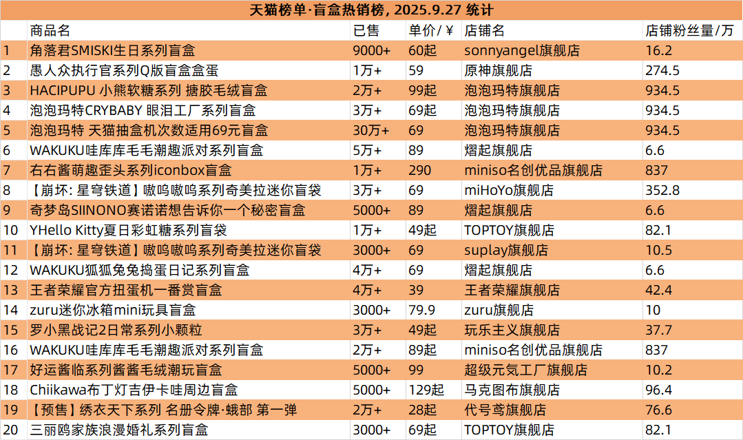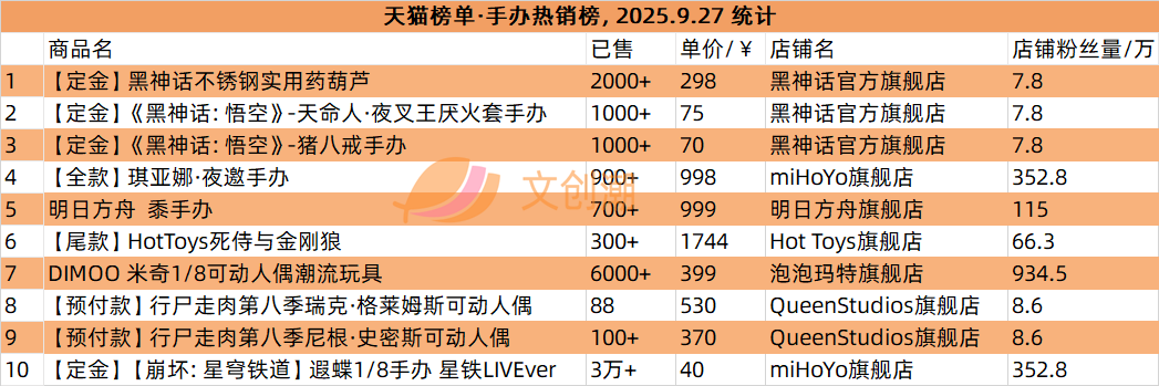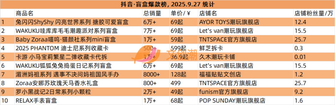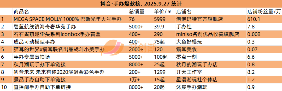 抖音平台榜单实时更新,文创潮9月27日统计到的盲盒、手办、卡牌三大品类的爆款前十名,如图所示。