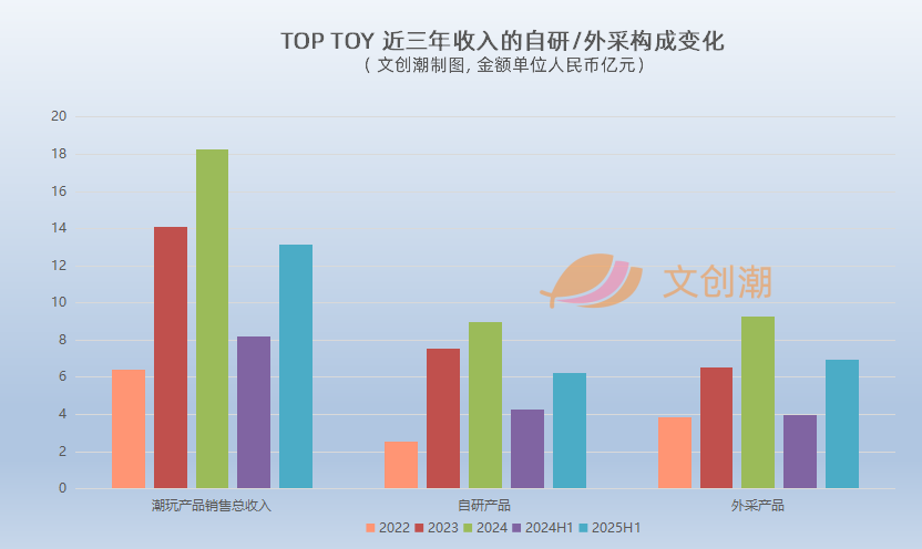 上半年,TOP TOY有47%的收入由自研产品贡献,其中大部分(6.153亿元)来自三丽鸥、迪士尼、咏声动漫等外部版权方的授权IP,有少量(610万元)来自“卷卷羊”“大力招财”等自有IP。