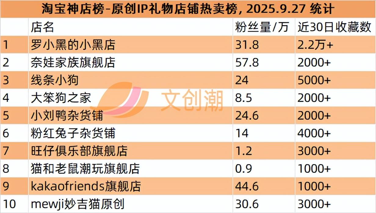原创IP礼物店铺热卖榜,前五名分别是: