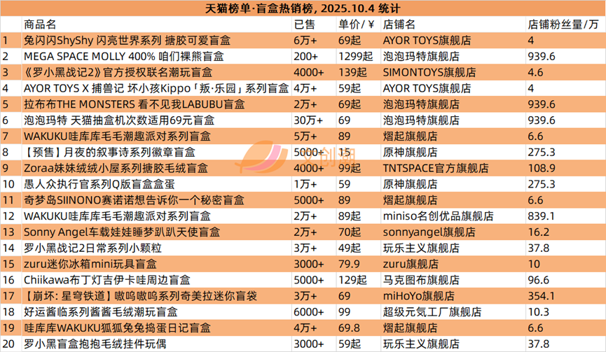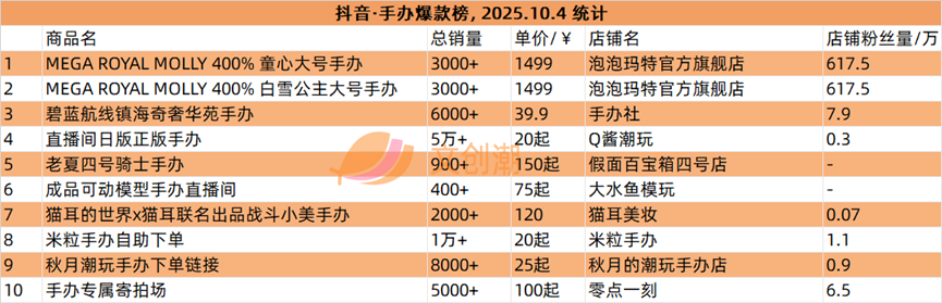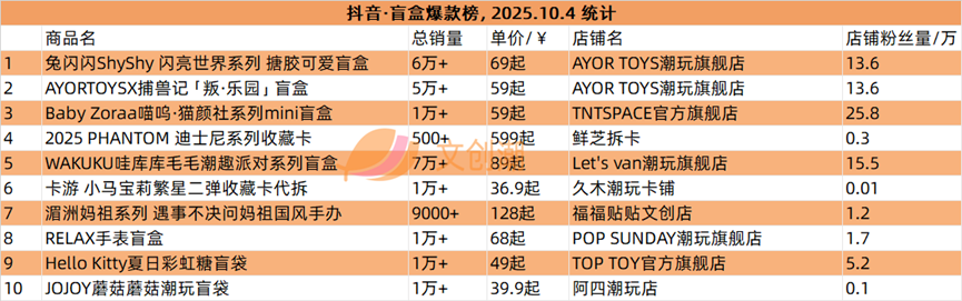 抖音平台榜单实时更新,文创潮10月4日统计到的盲盒、手办、卡牌三大品类的爆款前十名,如图所示。