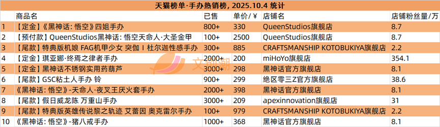再来看看手办的情况,天猫手办热销榜第一是《黑神话:悟空》四姐手办。