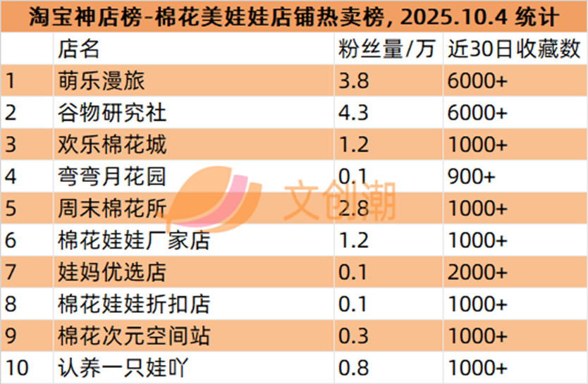 棉花美娃娃店铺热卖榜,前五名分别是: