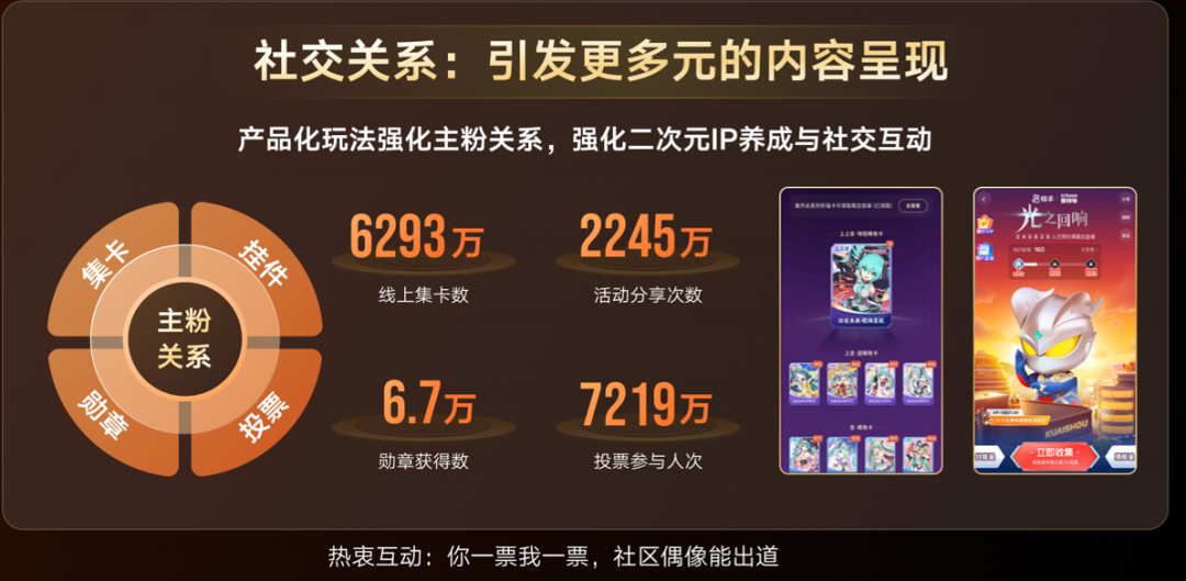 “很多快手用户的私域粘性非常的高,许多年轻用户来自中小城镇,他们拥有相对充裕的可支配时间,但现实中缺乏关注与陪伴。他们渴望通过IP寻求认同、获得共鸣,并以此为基础,在线上构建自己的社交圈层,满足其交友与归属感的需求。”集卡和养成玩法,正好放大了用户之间的社交互动,增强用户对IP的归属感和认同感。”