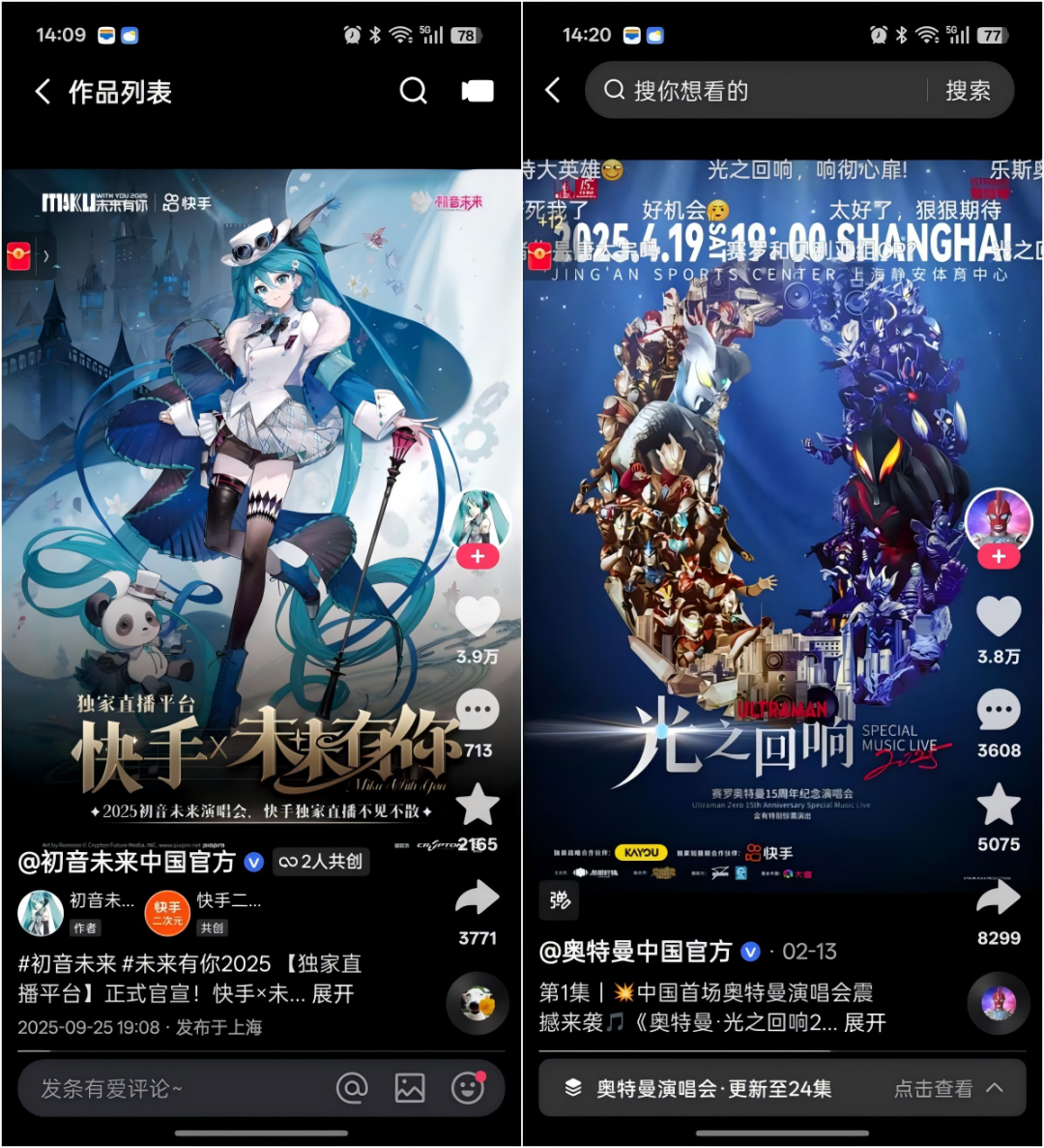 去年7月,初音未来演唱会快手线上独播,总观看人数超过8304万;今年4月,赛罗奥特曼15周年纪念演唱会在快手平台独家播出,创下8506万在线观看人次的亮眼成绩;今年8月,快手联动初音未来、熊出没、喜羊羊与灰太狼等六大二次元人气IP,在成都举办“成都限定夏日IP集友会”,打造了一系列线下快闪活动。