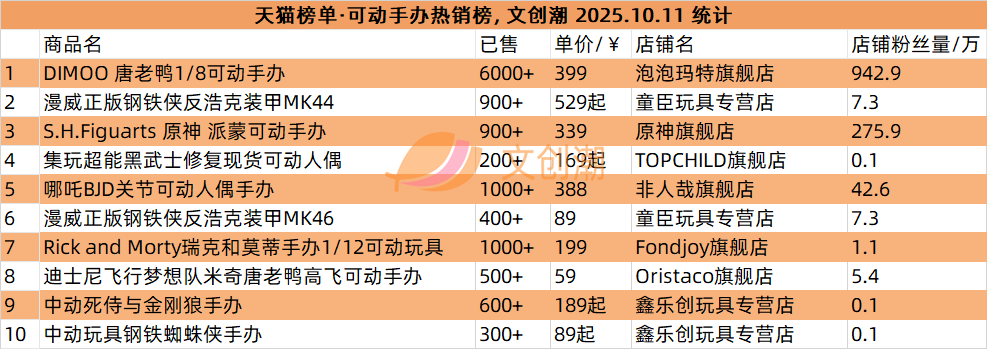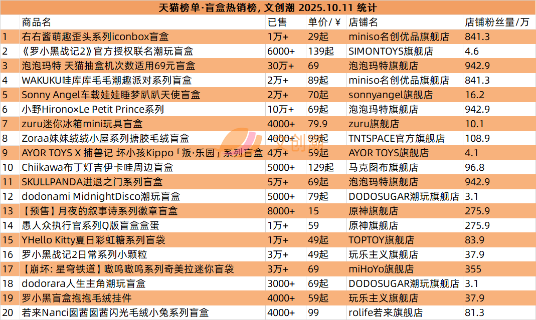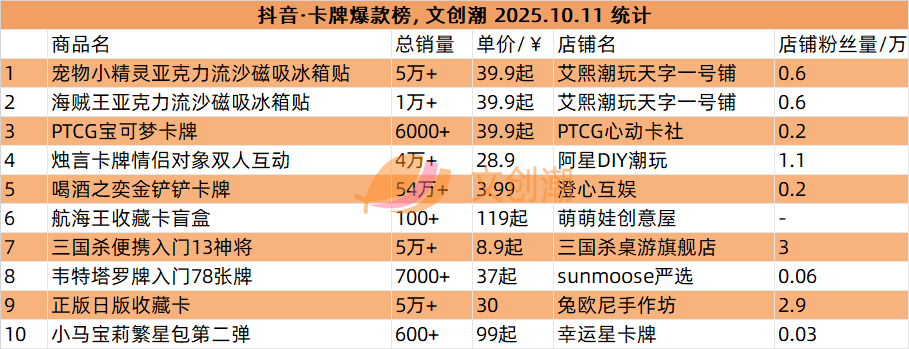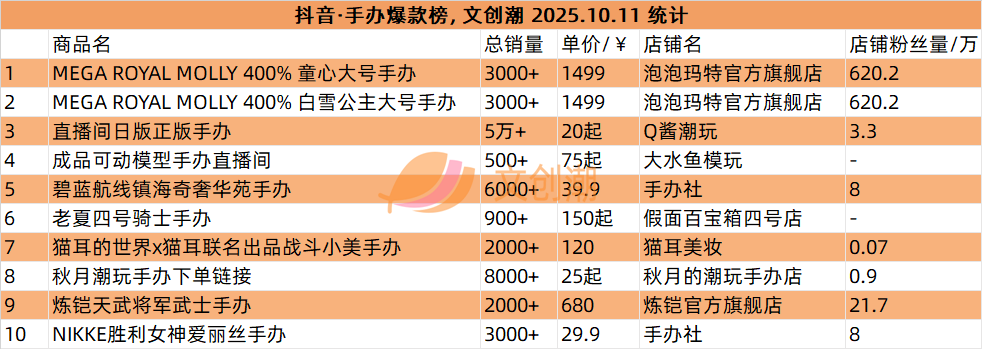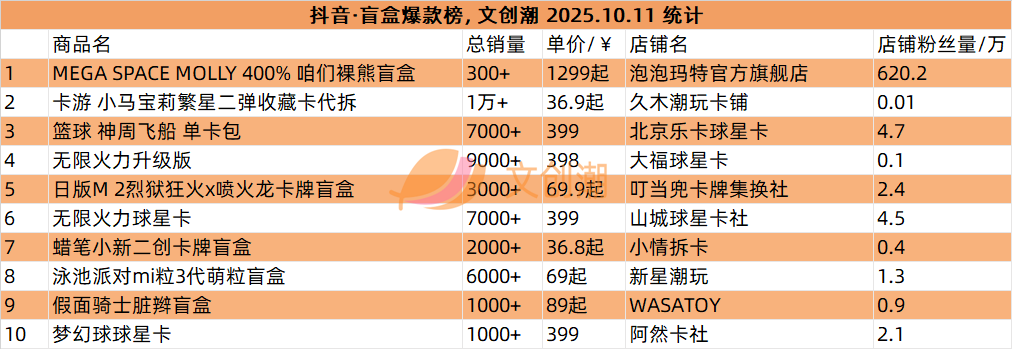 抖音平台榜单实时更新,文创潮10月11日统计到的盲盒、手办、卡牌三大品类的爆款前十名,如图所示。