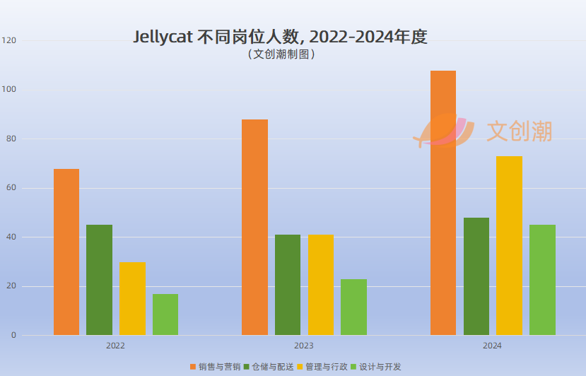 2023年,Jellycat有208人,其中销售与营销88人、仓储与配送41人、管理与行政41人、设计与开发23人。2024年,Jellycat有274人,其中销售与营销108人、仓储与配送48人、管理与行政73人、设计与开发45人。