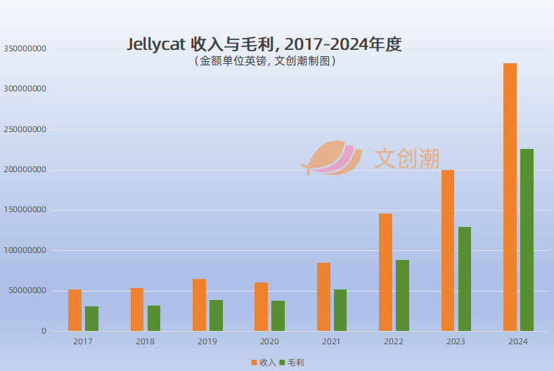 Jellycat的业绩从2021年开始突飞猛进,去年的收入相当于2019年的5倍,毛利接近6倍,毛利率也从疫情前的低于60%提升至接近70%。