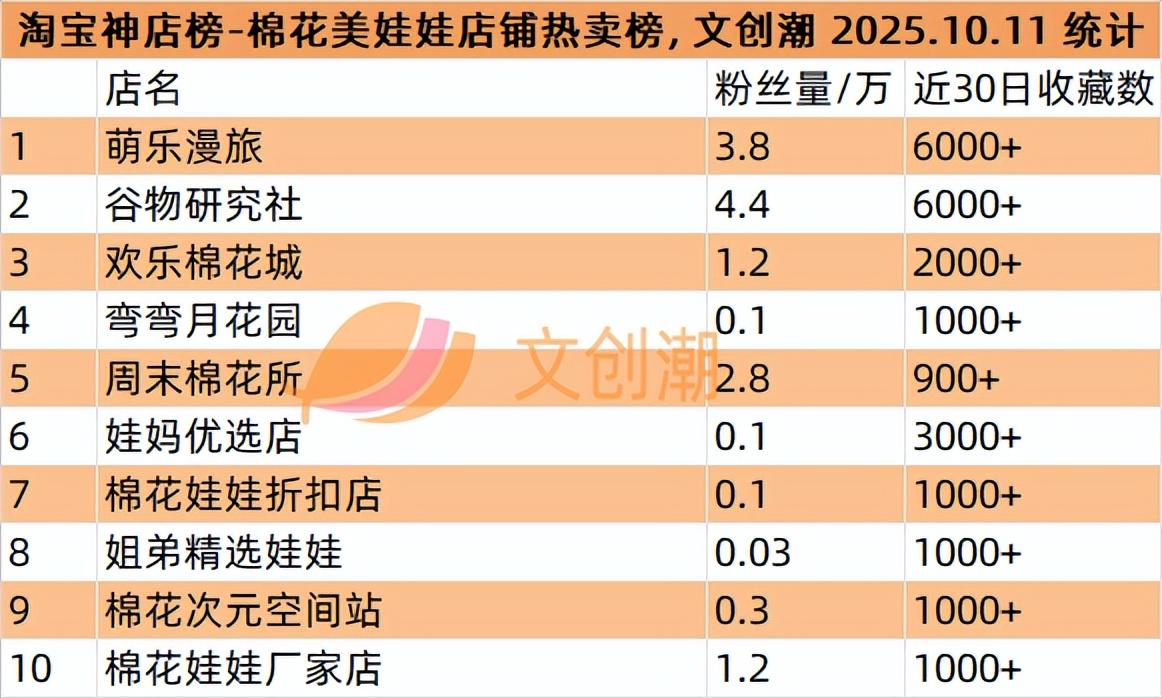 棉花美娃娃店铺热卖榜,前五名分别是: