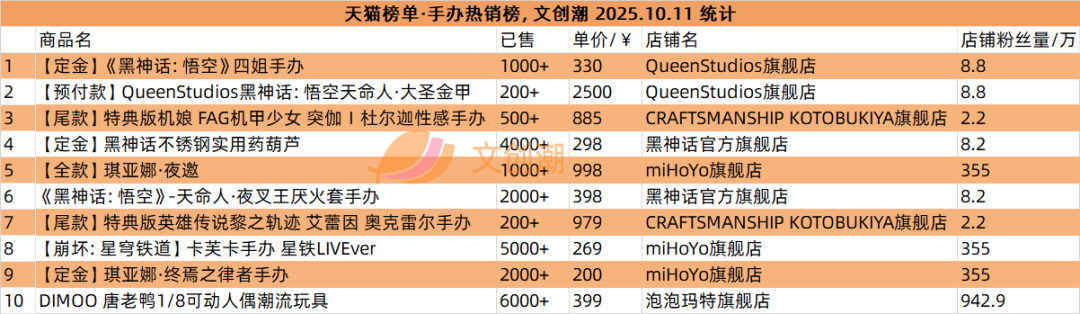 再来看看手办的情况,天猫手办热销榜第一是《黑神话:悟空》四姐手办。