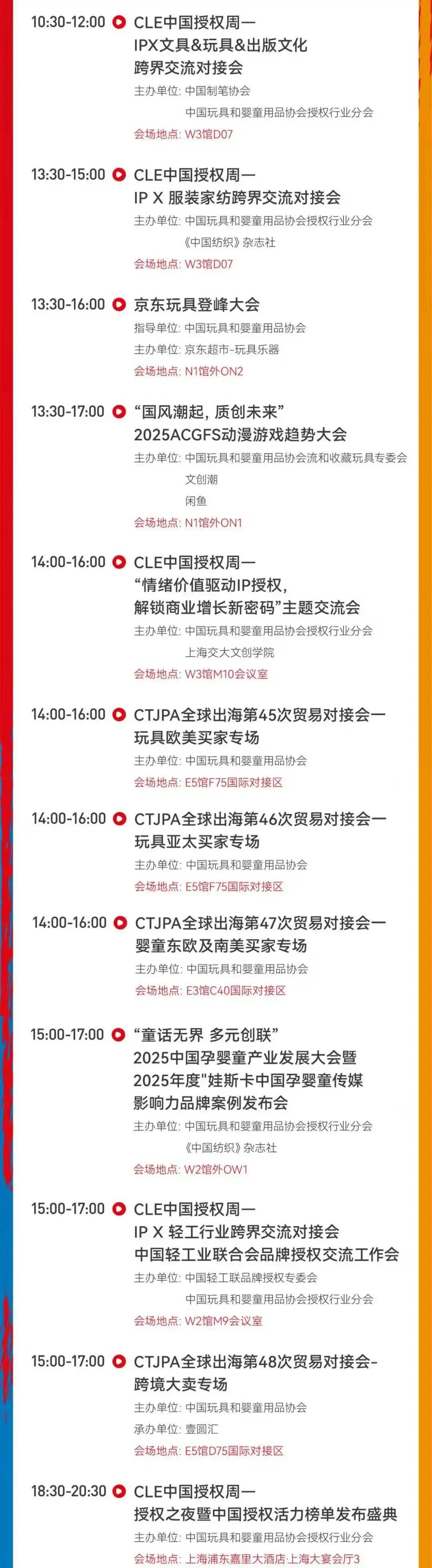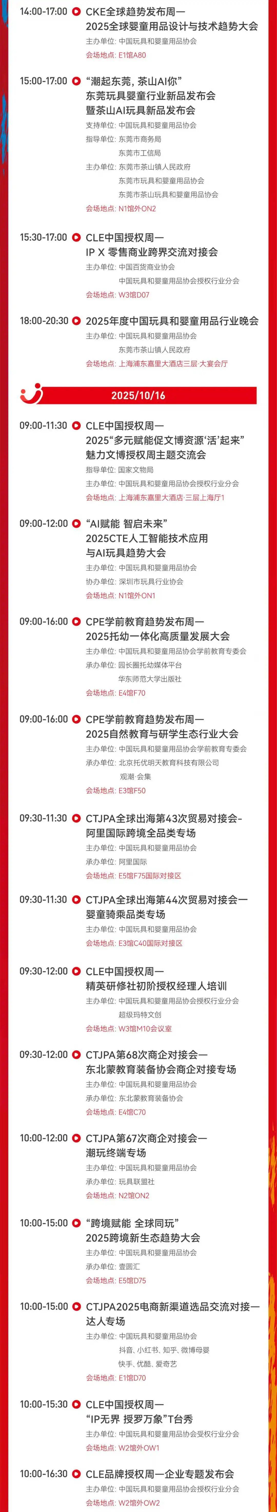 届时还将有超过200场活动举办,覆盖玩具潮玩、品牌授权、婴童用品、学前教育四大领域。包括第二十届中国授权行业趋势大会、第七届CTE全球潮流和收藏玩具趋势大会、2025 CTE人工智能技术应用与AI玩具趋势大会、ACGFS 2025等。
