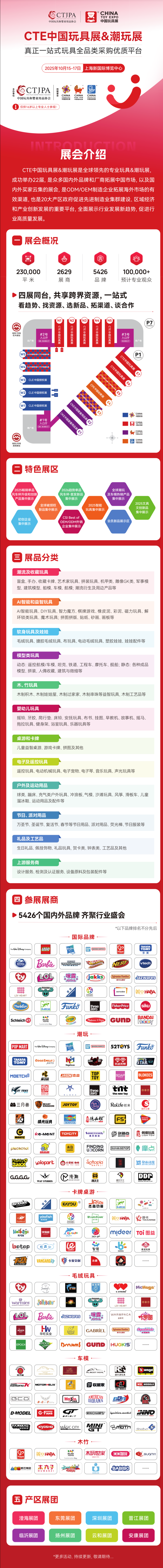 作为国家级行业协会主办,国内外展商和买家首选,全球领先的玩具潮玩、婴童用品、授权、幼教专业化和国际化商贸平台,中国玩协四展吸引了全球41个国家和地区以及30大玩具、婴童用品主产区2629位展商携5426个品牌、2600+全球正版IP参展,展览面积覆盖上海新国际博览中心全部展馆达23万平方米,齐聚国内外10万+专业观众。