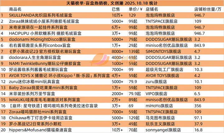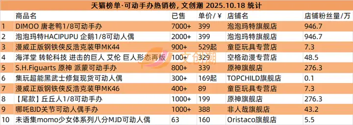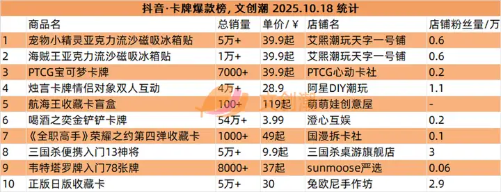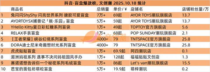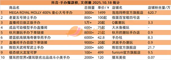 抖音平台榜单实时更新,文创潮10月18日统计到的盲盒、手办、卡牌三大品类的爆款前十名,如图所示。