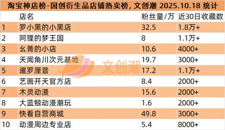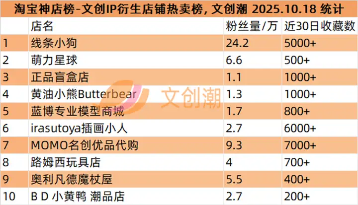 文创IP衍生店铺热卖榜,前五名分别是: