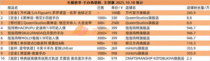 本期我们继续观察盲盒与手办的爆款产品,随后各类文创产品与店铺表现。