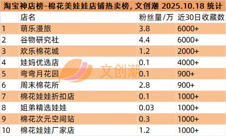 棉花美娃娃店铺热卖榜,前五名分别是: