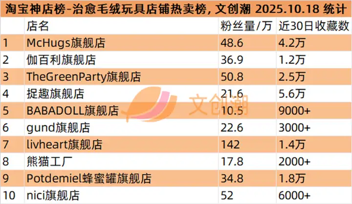 治愈毛绒玩具店铺热卖榜,前五名分别是: