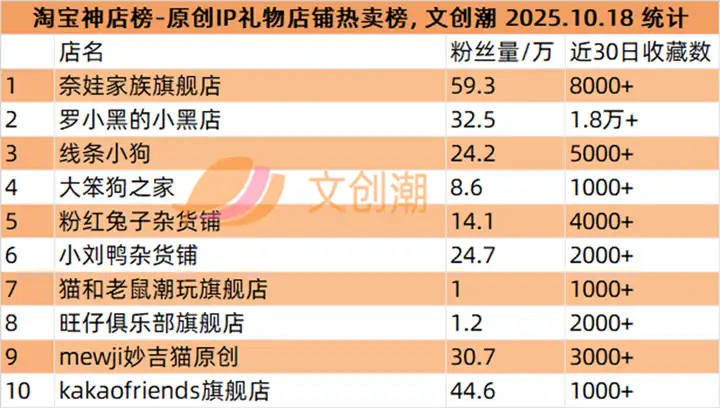 原创IP礼物店铺热卖榜,前五名分别是: