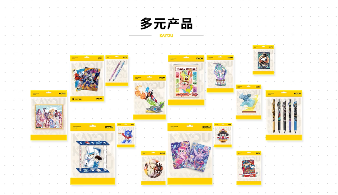 不过,从卡游近期的新品发售以及电商旗舰店信息看来,比起等待这些战略布局见效,卡游更多是在强调其“多元产品”,向消费者和经销商表明,卡牌之外它还有徽章、立牌、色纸、毛绒、笔、本册、橡皮人偶等众多周边。