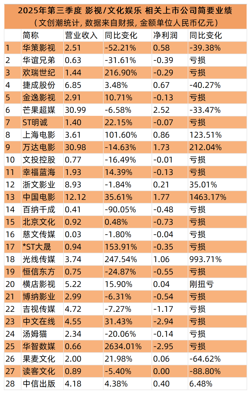 和影视/文化娱乐相关的28家,约半数实现收入增长,其中增幅超过5%的有华智数媒、光线传媒、欢瑞世纪、*ST大晟、上海电影、中国电影、中文在线、ST明诚、果麦文化、横店影视、幸福蓝海、金逸影视,共计12家。