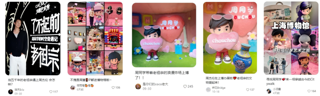 9月13日-10月12日,作为上海旅游节活动的重要组成部分,以及周杰伦演唱会上海收官站的延伸活动,巨星传奇以“周同学上海痛城”为主题概念,打造“乐游上海·寻找周同学”活动。活动以水陆空多维体验覆盖东方明珠、上海博物馆等六大城市地标,一个月内吸引近145万人次参与,线上触达超2000万人次。
