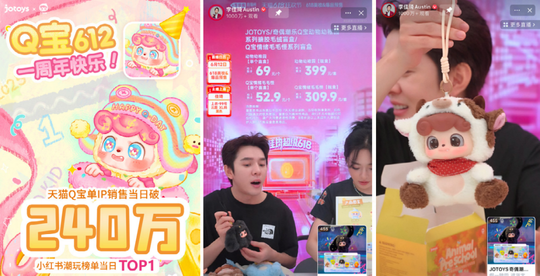 比如直播间与娱乐内容的合作。6月12日,Q宝作为首个潮玩IP案例登上李佳琦直播间,当晚销售额就突破240万元,小红书生日会专场直播登顶潮玩榜单TOP1。这次不仅带来直接销售转化,更凭借成千上万用户自发好评分享,引发“全网晒娃”热潮。