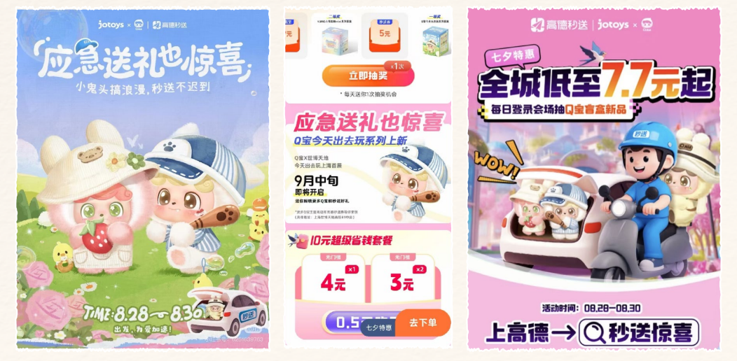 与滴滴出行、高德地图的场景化合作,进一步突破Q宝的IP外延。比如与滴滴出行的联动,通过联合车站装置、近百辆Q宝痛车“炸街”、上海快闪盲盒派发纸质打车券、滴滴跨平台官方号与App端内百万资源曝光……双方密切配合,共建引流闭环。