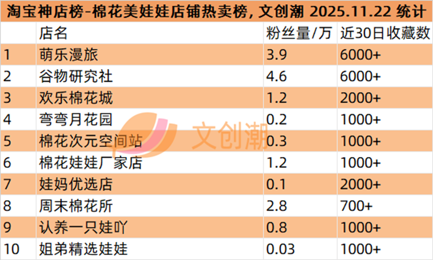 棉花美娃娃店铺热卖榜,前五名分别是: