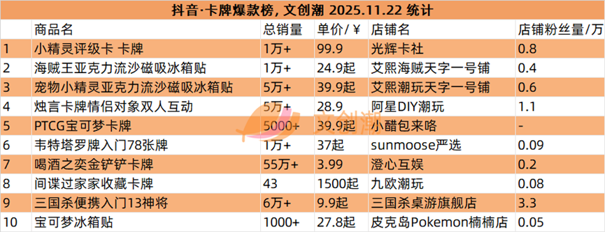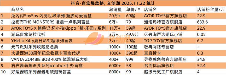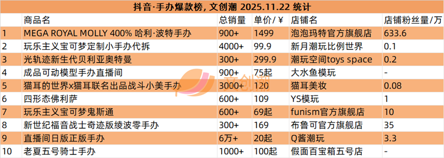 抖音平台榜单实时更新,文创潮11月22日统计到的盲盒、手办、卡牌三大品类的爆款前十名,如图所示。