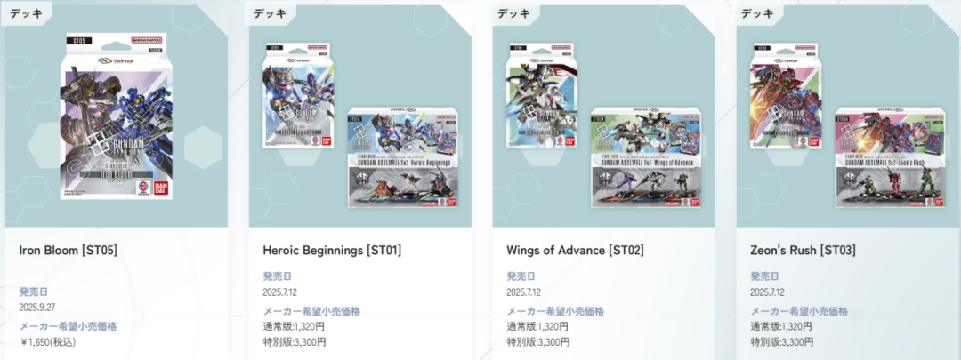 7月,万代高达GCG正式面向全球54个国家个地区发售,3季度共发售了6款基本卡组和补充包,其中01-04号卡组分为通常版(1320日元)和汇战版(3300日元),汇战套装中包含了3款高达拼装板件,以及搭配使用的替代卡。搭配高达模型对战的游戏策略,与影视作品高度契合,深受玩家喜爱。高达GCG在欧美的人气远超预期,市场反响热烈。
