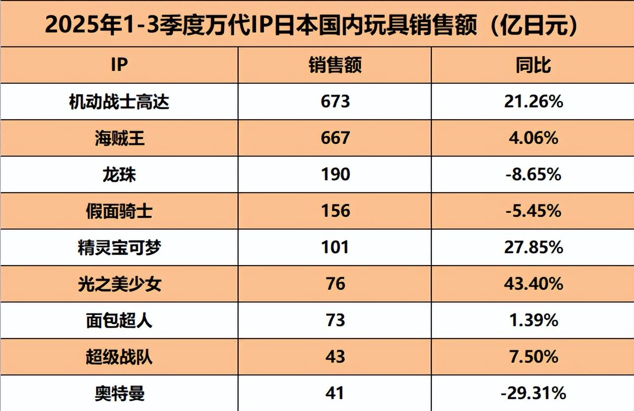 2025年1-3季度,万代各IP的玩具商品销售额如上图所示。