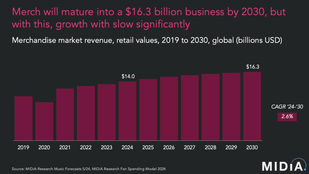 MIDiA一年前的报告指出,音乐周边市场已经超越了廉价T恤和帽子的传统范畴,快闪体验和定制商品已成为超级巨星专辑发行和巡回演唱会的标配,大量唱片公司开始关注粉丝群体的商业化,周边商品是其中一个主要切入点。