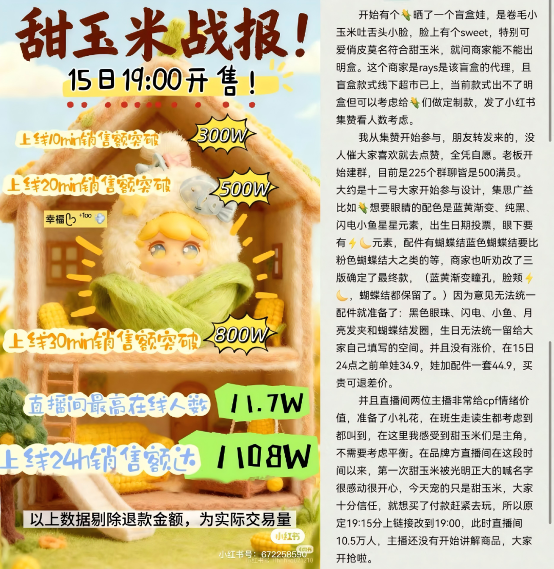 根据用户的描述,这不是一场传统的“授权-出品-发售”,而是厂商快速响应艺人CP粉丝的需求,在社群讨论、共创设计之后,为粉丝们“量身定制”的潮玩产品,直播间最高在线人数11.7万,产品正式上线20分钟就突破500万的销售额。