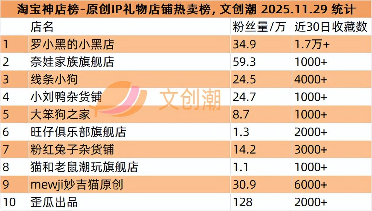 比如文创潮周汇栏目的统计显示,“奈娃家族”(NEVER’S FAMILY)长期位列淘宝神店榜-原创IP礼物店铺热卖榜的前列。奈娃家族以网红主播李佳琦的比熊犬为原型,曾有爆品登上天猫手办热销榜的榜首。