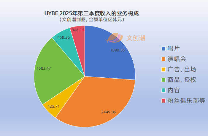 比如运营防弹少年团(BTS)、SEVENTEEN等娱乐团体的HYBE,2025年第三季度的商品与授权收入约1683.47亿韩元(折算人民币超过8亿元),是它的第三大收入板块,仅次于唱片和演唱会(文创潮注:有很多统计会将唱片也算作音乐艺人周边)。