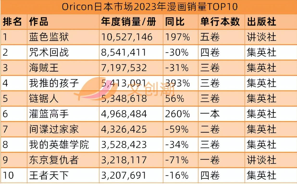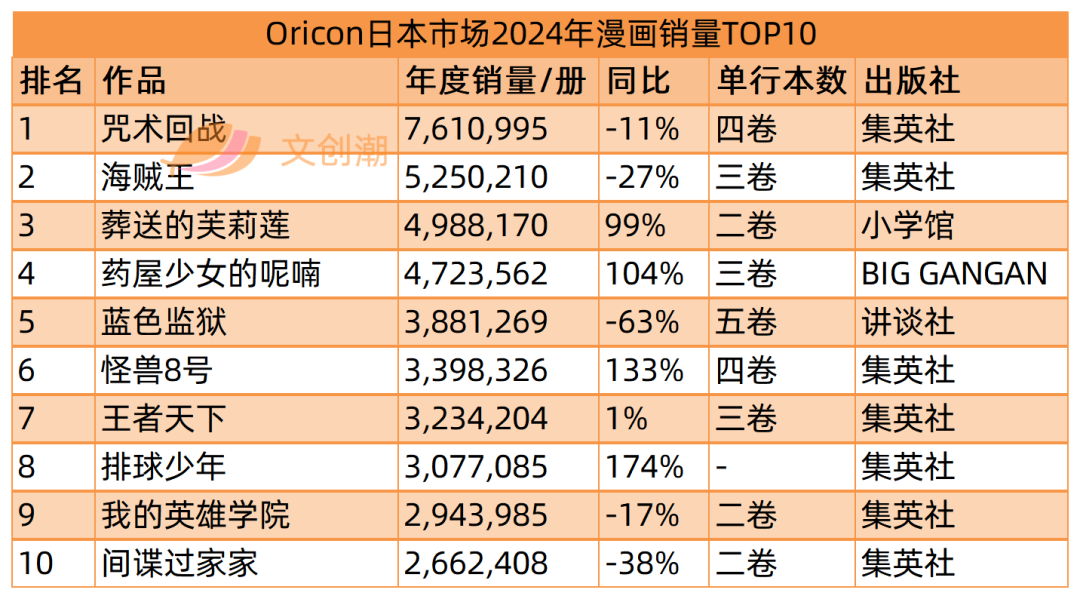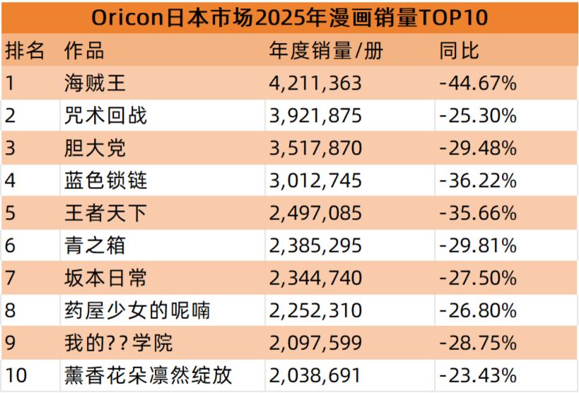 Oricon数据显示,2025年日本漫画销量前十分别为海贼王、咒术回战、胆大党、蓝色锁链、王者天下、青之箱、坂本日常、药屋少女的呢喃、我的??学院、薰香花朵凛然绽放。