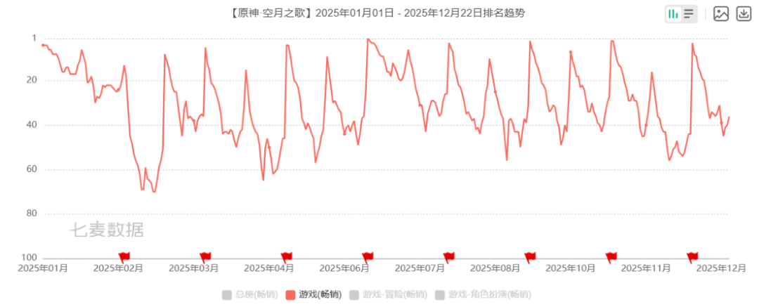 比如米哈游《原神》,2024上半年基本都保持在iOS中国区游戏畅销榜的前二十,如今一般是在20-60名之间,在推出运营活动的时候才会冲回前二十。