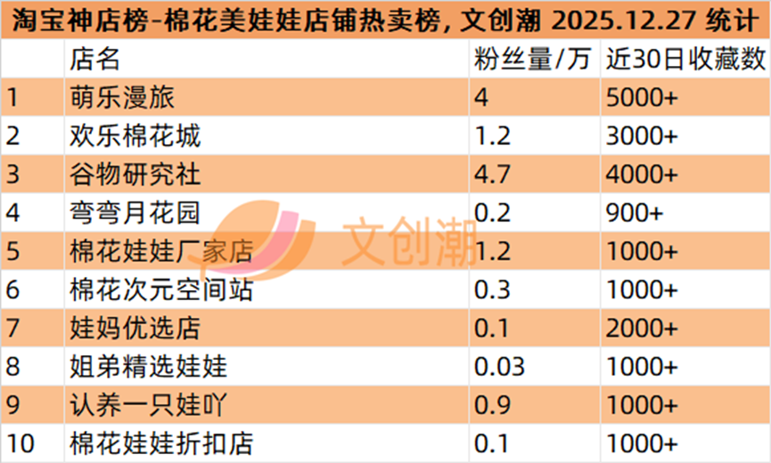 棉花美娃娃店铺热卖榜,前五名分别是:
