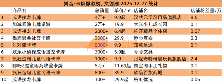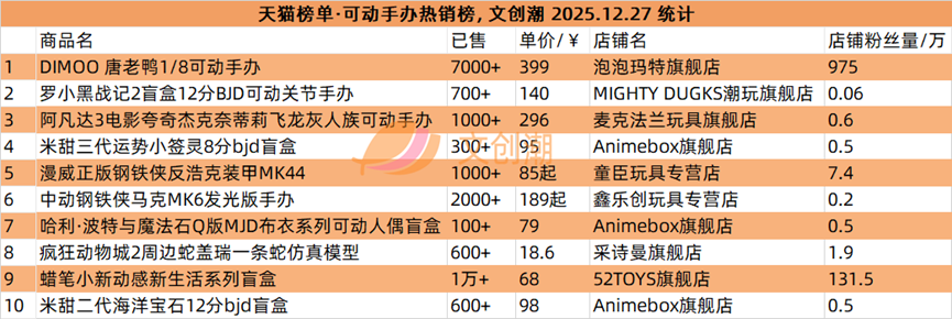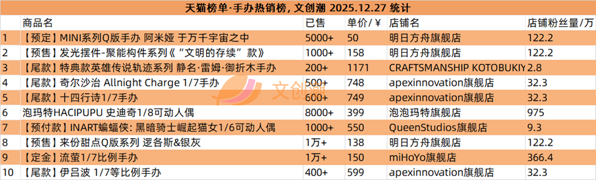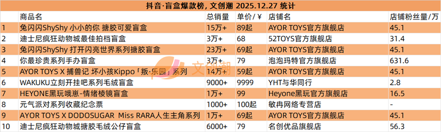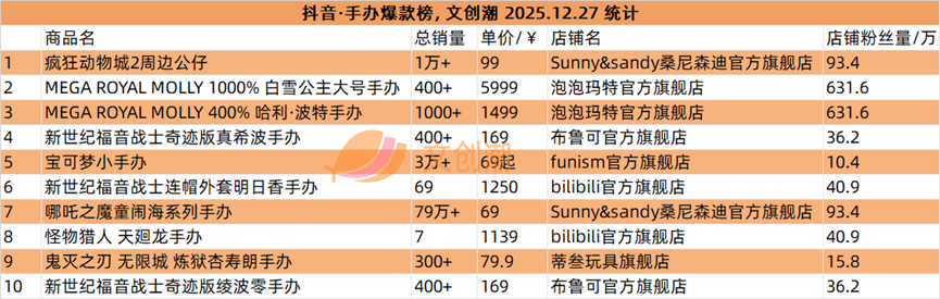 抖音平台榜单实时更新,文创潮12月27日统计到的盲盒、手办、卡牌三大品类的爆款前十名,如图所示。