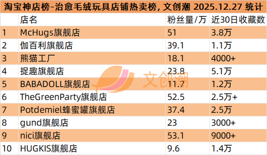治愈毛绒玩具店铺热卖榜,前五名分别是:
