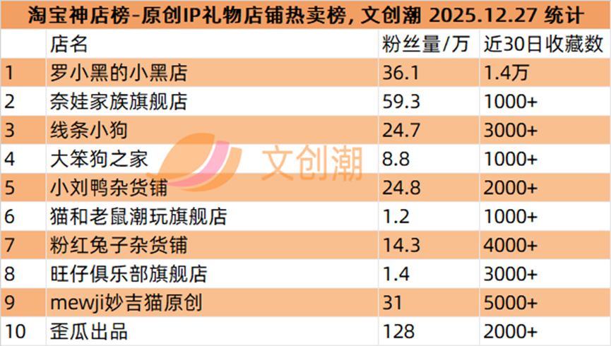 罗小黑的小黑店、奈娃家族旗舰店、线条小狗、大笨狗之家、小刘鸭杂货铺。