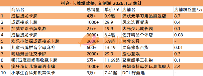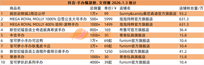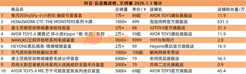 抖音平台榜单实时更新,文创潮1月3日统计到的盲盒、手办、卡牌三大品类的爆款前十名,如图所示。