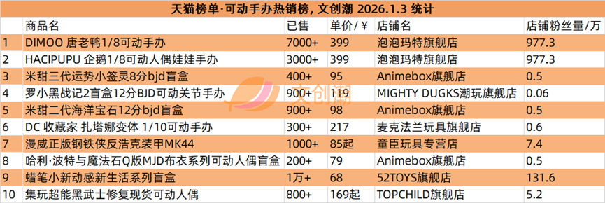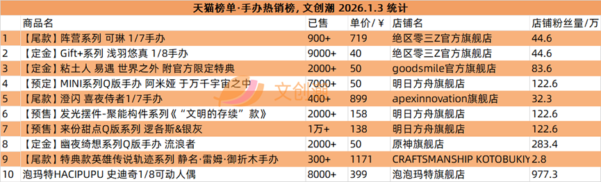 本期我们继续观察盲盒与手办的爆款产品,随后各类文创产品与店铺表现。