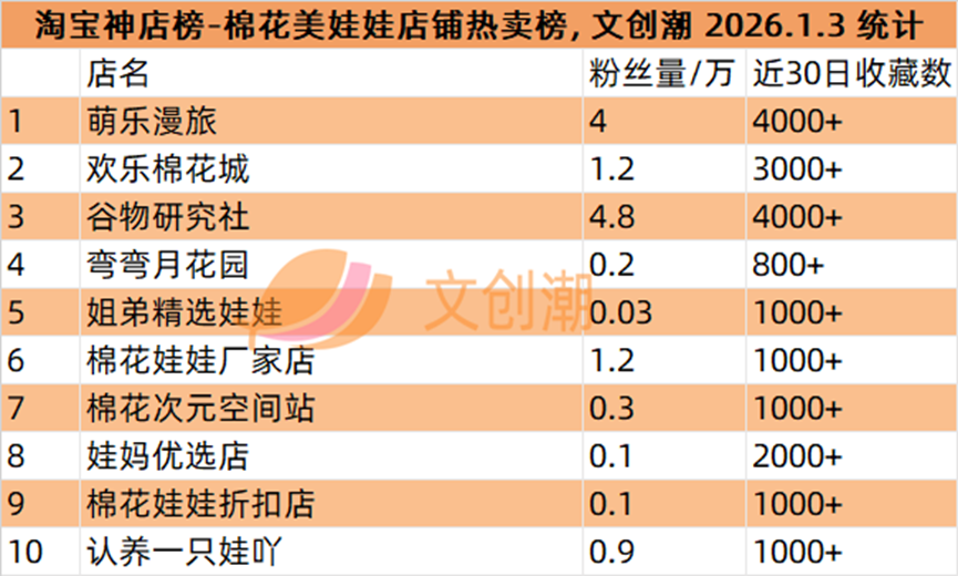 棉花美娃娃店铺热卖榜,前五名分别是:
