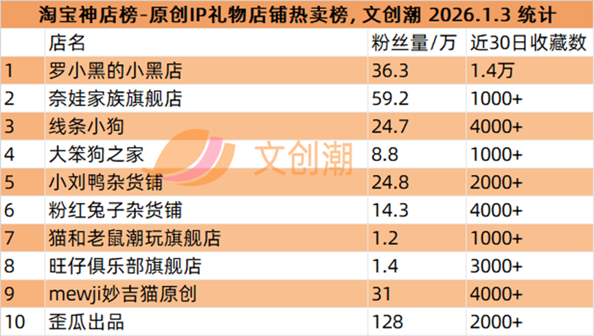 原创IP礼物店铺热卖榜,前五名分别是: