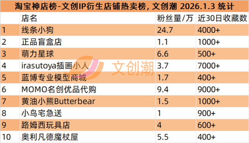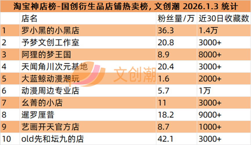 文创IP衍生店铺热卖榜,前五名分别是: