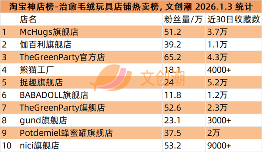 治愈毛绒玩具店铺热卖榜,前五名分别是: